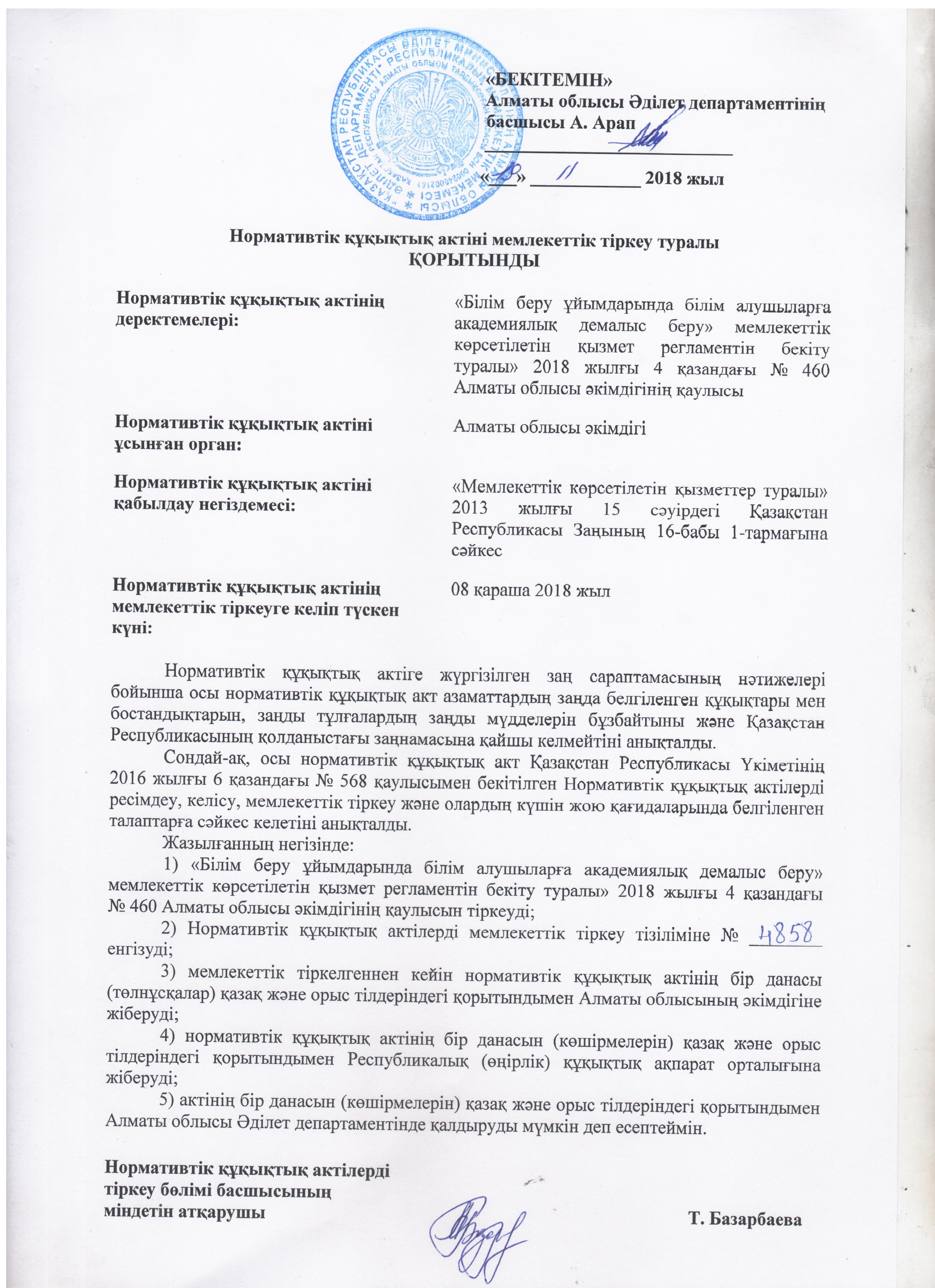 Нормативтік құқықтық актіні мемлекеттік тіркеу туралы